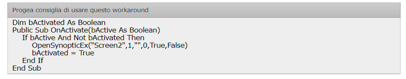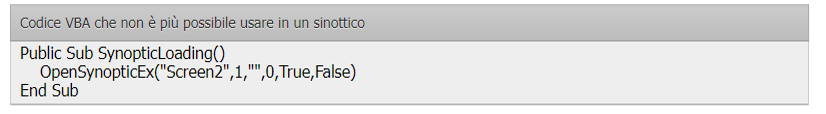 Since build 957 of Movicon, the code handling page changes has been strengthened. As a result of these changes, it's no longer possible to open a synoptic while another synoptic is still being opened, for example using VBA code in the "SynopticLoading" event of a synoptic.