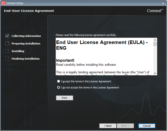 The next window shows the terms of the license agreement. In order to continue, accept them and click on the Next button.