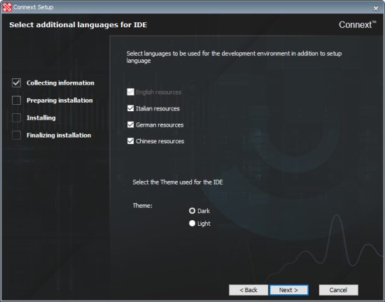 The next selection will be to choose the language(s) in which the product resources will be installed and the theme of the development environment (Integrated Development Environment) on a light or dark background. Click on the Next button in order to continue with the configuration of the product.