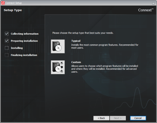 At this point of the installation you will be asked whether to continue with "Typical" mode (recommended choice) or "Custom". As for the "Custom" mode, you will be able to assign some specific parameters and specify the program installation path.