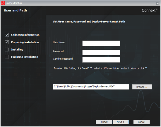 Once you have finished customizing the installation path, you have the ability to preconfigure the installation path and user for the DeployServer installation on the machine where is present also the editor.