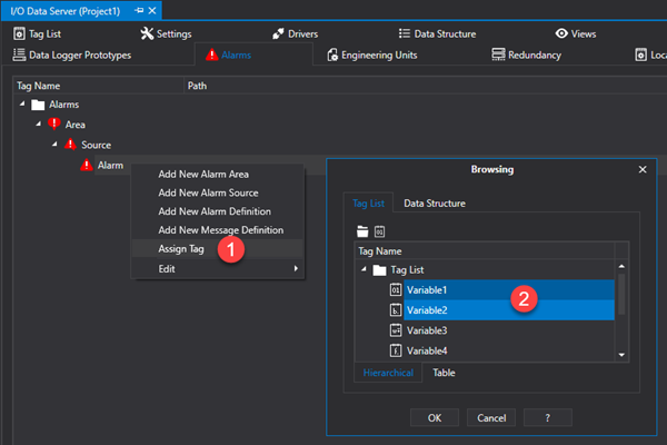 After the Alarms have been defined and configured in the project, they will need to be assigned tags.