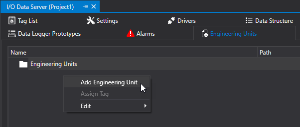 To create a new Engineering Unit simply open the I/O Data Server Engineering Resource and select 'Add Engineering Unit' from the contextual menu.