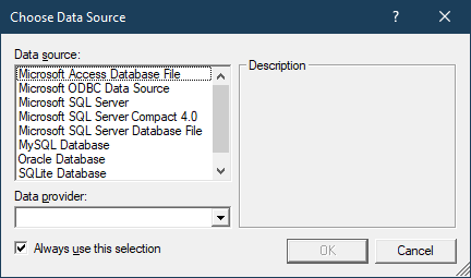 This wizard allows fast configuration of the ODBC, Access, SQL Server, MySQl, SQLite and Oracle data sources.