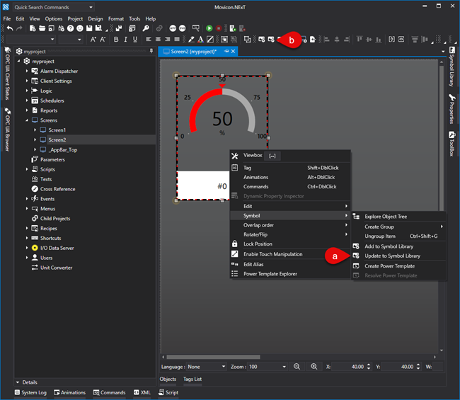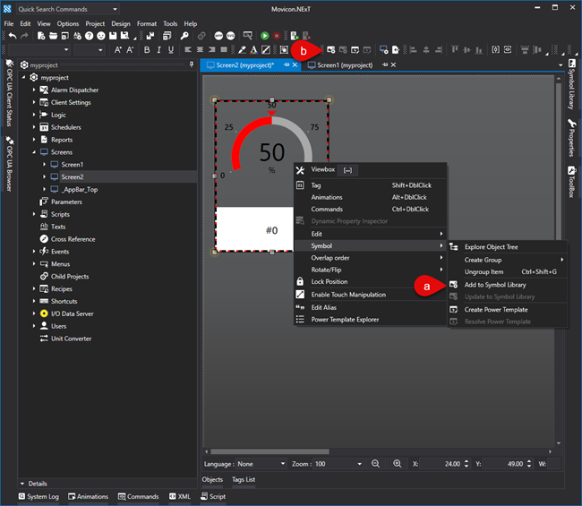 The graphic object used on screen (User Controls from the toolbox and Symbols from the System's Library) can be grouped together to form a customized symbol composed of a mixed number of elements. This mechanism can result very handy when, for example, the customized symbol must be used many times in the project. These symbols can also be added to the Project's Symbol Library for subsequent reuse.