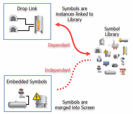 When dragging a symbol from the library on screen with the "Drop Link" option active, a symbol instance is created on screen which will remain "linked" to the symbol library.