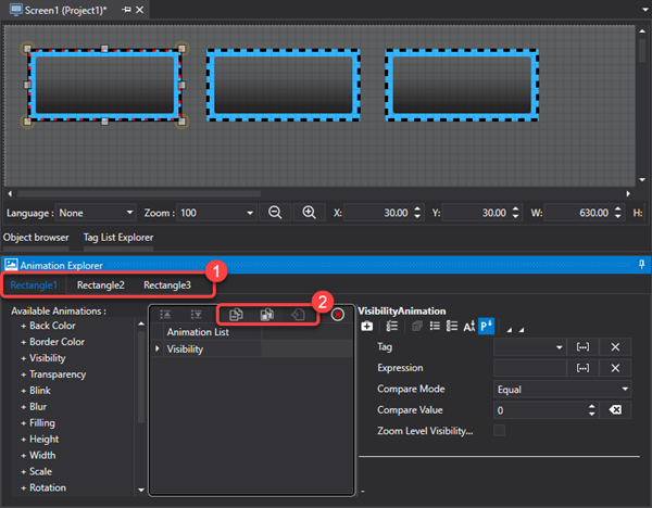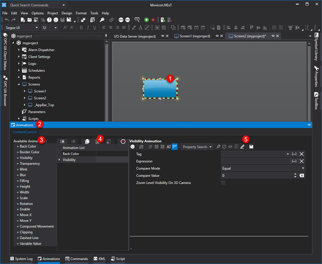 Movicon.NExT Object and Symbol animations can be set using the "Animation Explorer" window. This is done by associating Tags that determine the symbol or object's graphical animation during Runtime.