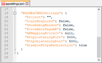 The WebHMI's integrated Web Server settings can be changed by editing the "appsettings.json" file which is found in "C:\Program Files\Progea\Movicon.NExT 4.0\WebHMIServer\"