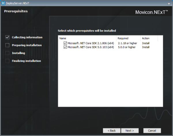 Once the Setup has been launched, a check will be run to see whether the .NET Core 2.1 and 5.0 packets, which are needed for running the Deploy Server and other components at Runtime, have been installed. If they have not been installed, the Setup will download them from the Microsoft website and install them.