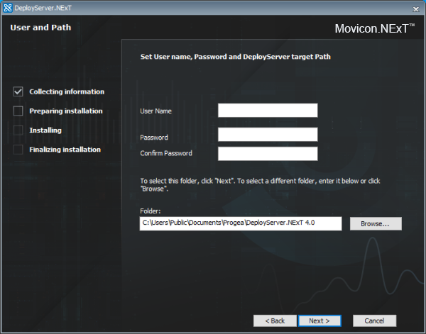 This last setup phase that asks for credentials and target folder can be skipped by launching the Deploy Server's setup from command line as follows: DeployServerNext.exe DEPLOYUSERNAME={username} DEPLOYPASSWORD={password} DEPLOYPATH={absolute_path} For example: DeployServerNext.exe DEPLOYUSERNAME=admin@company.com DEPLOYPASSWORD=Password123$ DEPLOYPATH=C:\WebHMI |