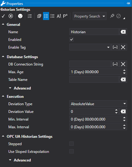 The "MaxAge:" parameter defines how long data must be kept in the table. Data older than the value set here will be deleted. Data are deleted from the DataBase in blocks by means of the XPO provider in order to prevent such execution being weighed down with delete queries potentially concerning mulitple records which would require much more time. Data are deleted after the first Historian recording event when there are records found to be older than the set max. age.