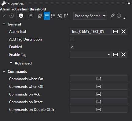 Once an Alarm Definition has been associated to the Tags, the alarm associated to each individual Tag can be configured in its properties as indicated below: