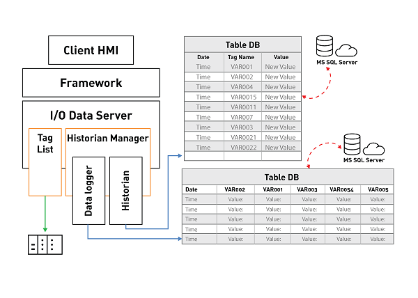 For each variable value association, that satisfied the criteria configured in the Historian, a row will be recorded in the Database table containing: the date and time, current variable value, previous variable value and other information.