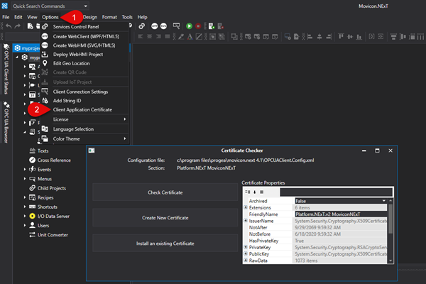 The certificated of Movicon.NExT Client side called "Platform.NExT.v2 MoviconNExT" can be checked, renamed or replace by using the configuration tool accessible from the menu > option and selecting the Application Certificate (2) item.