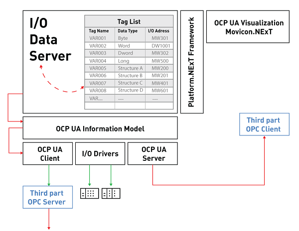 The Movicon.NExT I/O Data Server module is the communication and data management server which is essential for the platform's projects. The Data Server manages communications with the field and with third party systems by defining and centralizing dynamic information through the use of Tags which define variables on the project's Tag List.