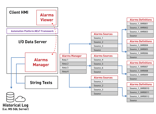 As you can see from this diagram, the Alarm structure provided that possibility to sub-divide alarms in diverse Areas, that can be defined diverse Sources, each one of which can have their own Alarm Definitions.