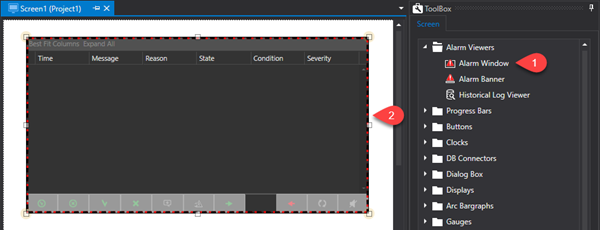 The Alarm Window object, available from the Toolbox, is used for listing active project alarms. In addition to viewing alarms the Alarm Window can be used for performing other operations by using the buttons described below: