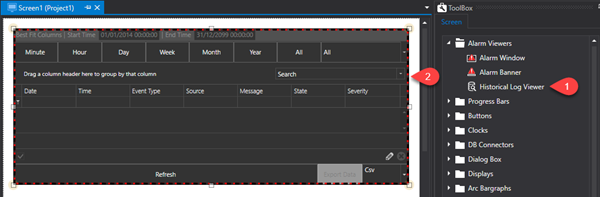 During the Project Runtime phase, you can view Alarms and Events recorded on Data Base by the Alarm Manager during runtime. The Historical Log events can be viewed using the "Event Logger Viewer" object which can be taken from the Toolbox and inserted on Screen.