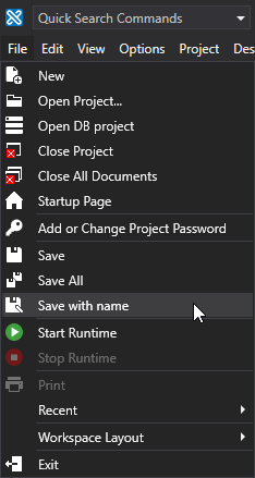 The "Save with Name" command from the "File" menu can be used to select a new name for the project as well as the target folder.