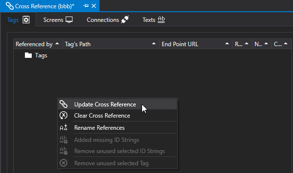 Right click to execute the "Rename References" command for the tags or select the command from the "Cross Reference" menu to update the tag connections with the application's new name.