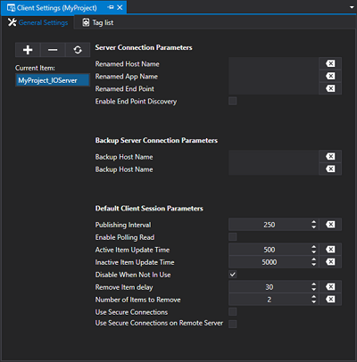 This settings window can be accessed through the "Client Configuration > Client Settings" resource from the project tree and allows you to define the Client's connection parameters towards the Server.