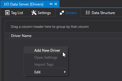 In order to insert a new communication driver, you will need to open the I/O Data Server resource and select the "Drivers" pane.