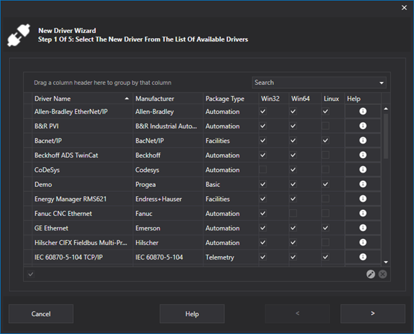 The list of drivers shows which drivers are available grouped by the name of the Manufacturer and by device or protocol type.