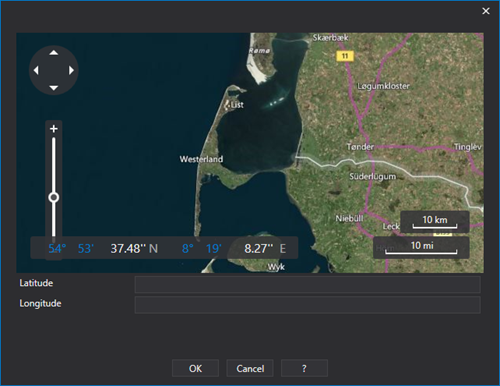 This window is used to navigate around the map and when clicking on any point, the tool will give the Latitude and Longitude coordinates. It is also possible to enter a specific address by typing it in the "Address" edit box and then confirm with the "Search" key. The map will automatically go to the position of the geographic address and return the Latitude and Longitude values.