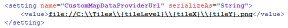3b. "CustomMapDataProviderUrl" setting it as "file://C:\\Tiles\\{tileLevel}\\{tileX}\\{tileY}.png" as shown below: