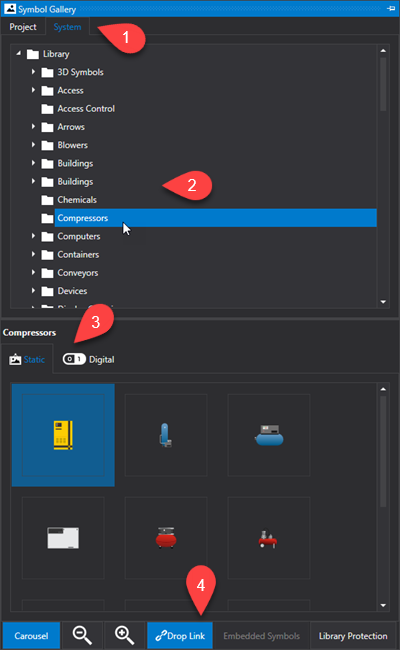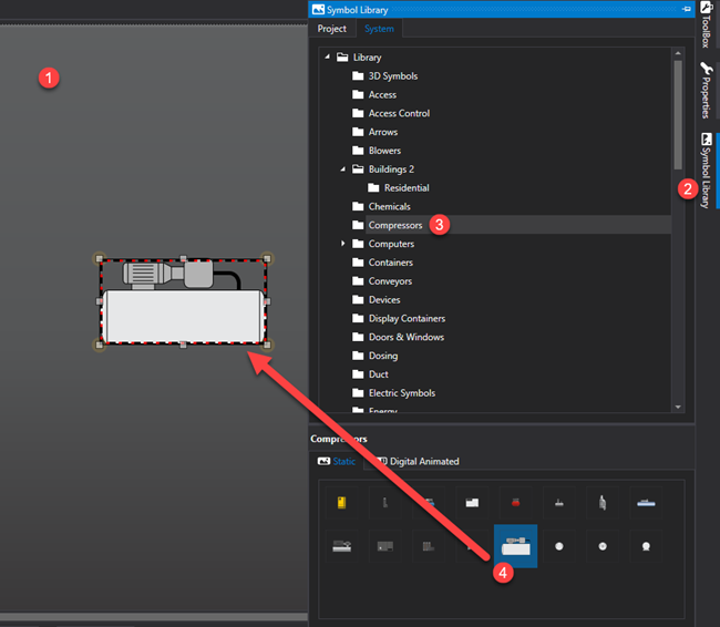 This Symbol Library can be accessed from screens using the relevant TAB on the right side of the workspace.