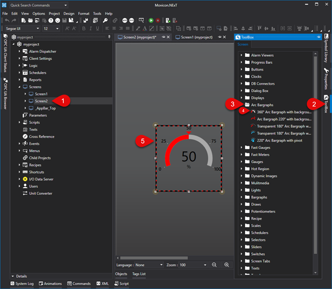 Movicon has a library called the Toolbox which is full of ready-to-use, predefined and configured objects. This Toolbox can be accessed from the screen using the Toolbox tab located to the right of the workspace.