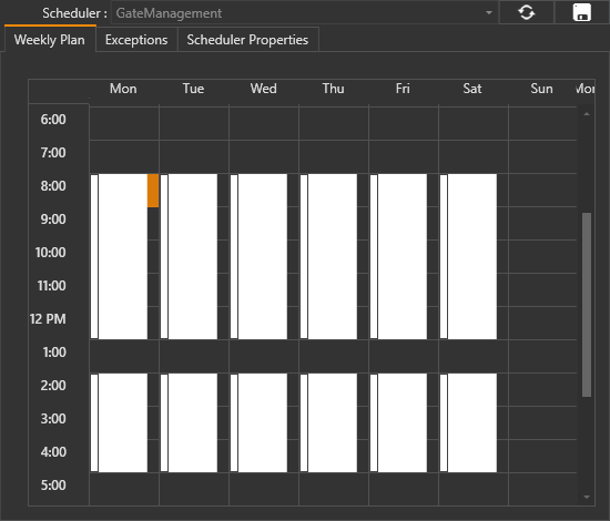 By using this graphical object, the operator can set scheduled events - where consented in the properties by the programmer - for each scheduler server object. The settings entered by the operator at runtime will have priority over those times set in object's properties in edit mode.