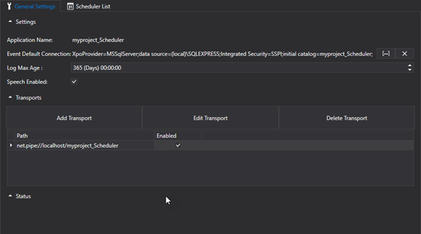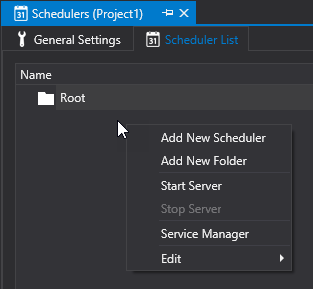 When selecting the Scheduler List tab, you will be able to insert new scheduler objects or display and modify those that already exist by using their Property window.