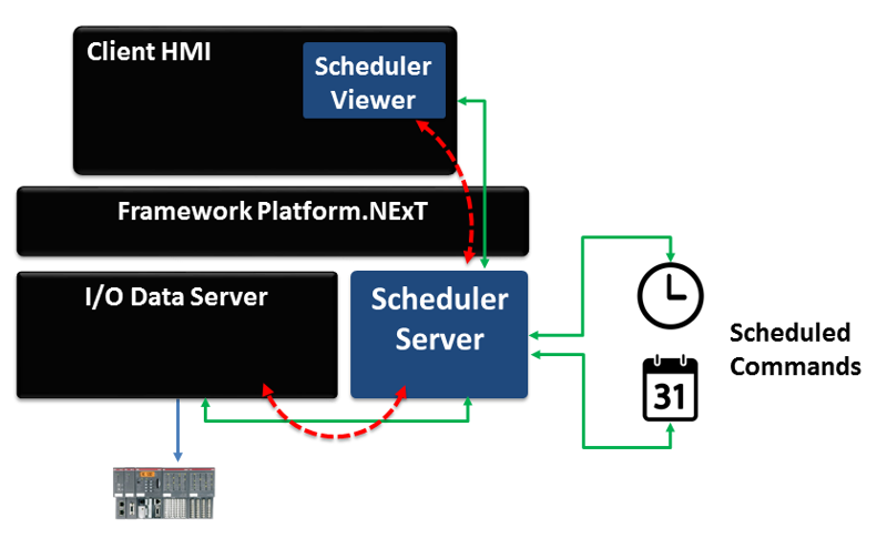 The Movicon.NExT Scheduler Manager is in fact a OPC UA Server that when started up connects as a Client to the Project's Data Server to access its tags. The graphical Scheduler objects also connect as Client but to the Scheduler Server instead. The Scheduler Server can be started up manually using the "Start Server" command from the toolbar, or automatically at the Movicon.NExT project startup in which it was configured.