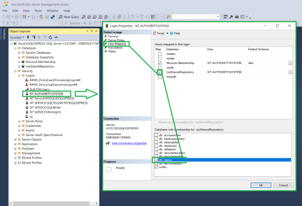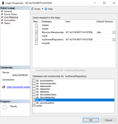 To share users between the Desktop Runtime project and WebHMI, you will need to activate the "db_owner" membership role property of the user, who was selected during the "Movicon.NExT WebClient (SVG/HTML5)" service installation using the Service Control Panel, for the chosen Database for sharing users. If no specific user is indicated during the "Movicon.NExT WebClient (SVG/HTML5)" service installation, the service will be installed with the "NT AUTHORITY\SYSTEM" system user credentials.