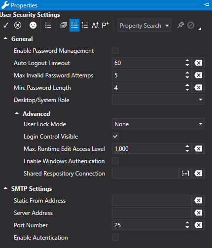 In addition to the general property settings, there is a "SMTPSettings" property group that allows you to set the report notification email functions.