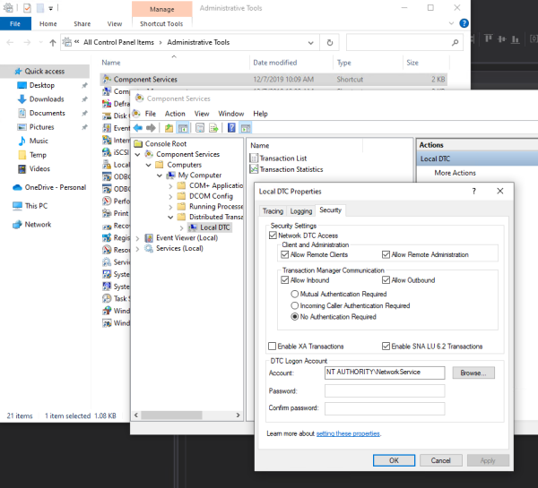 Check that the Distributed Transaction Coordinator service is active. If not launch it.