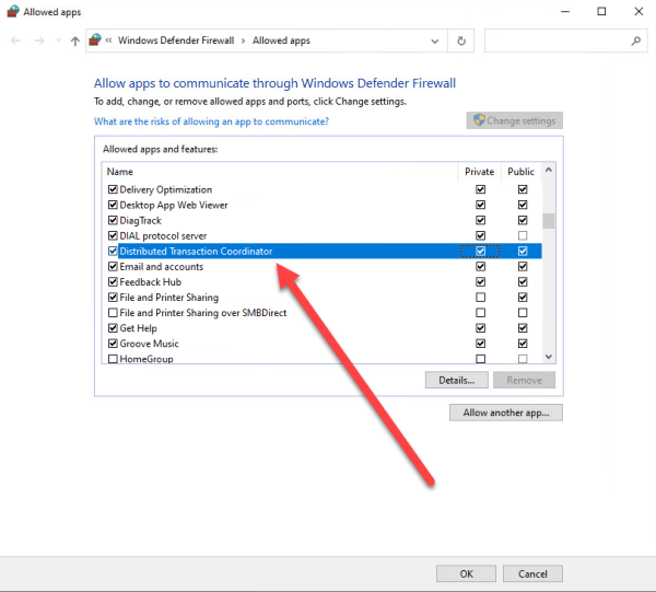 Add a Windows Firewall exception for the MSDTC process: by clicking on "Allow an app through firewall" and enabling the "Distributed Transaction Coordinator" process.