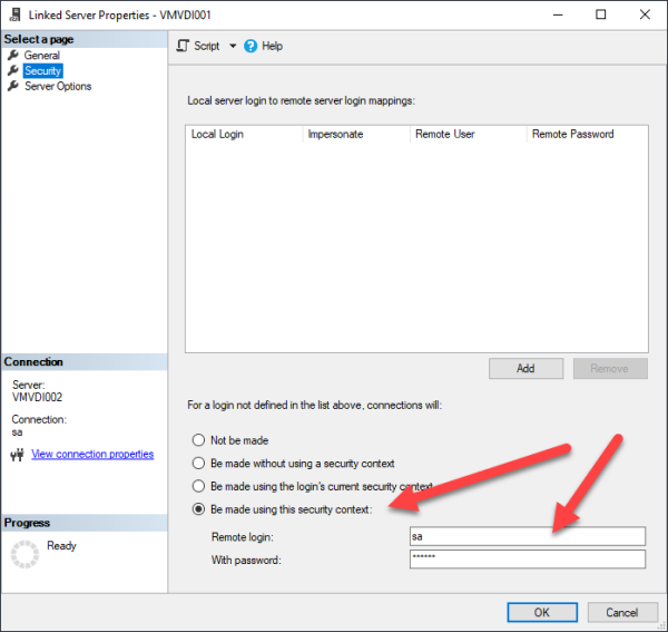 At this point on the server database containing the shared users repository and any backups, a linked server will be created for each machine that runs the Movicon.NExT project which has just been configured for shared users. A link to the server will be created at runtime startup, if not already server is not present. Each one of these Linked Servers should be configured to have the capability to be authenticated by remote on the database server to which it is referred to. Please see image below on this.