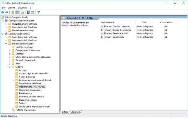 Attention: In addition, the “CTRL+ALT+CANC” combo keys cannot be blocked using this Movicon feature. In this case, the Windows' Local Group Policy Editor can be used to set these restrictions accordingly to prevent anti-malware from intervening. To startup the editor, digit “gpedit.msc” in Cortana's search bar and press enter: