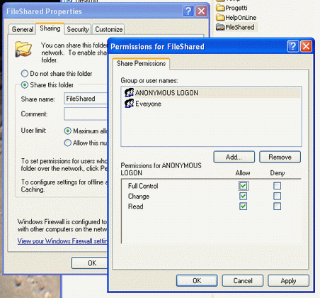 Let's suppose that the Movicon Application has to access, in read/write, files contained in the remote PC's "FileShared" folder. The settings to enter on this remote PC would be: