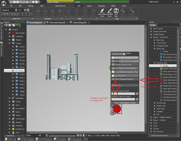 Nell'interfaccia utente dei sinottici è possibile inserire diverse tipologie di oggetti dedicati alla esecuzione di comandi oppure alla modifica del valore di un Tag. La Toolbox offre un'ampia scelta di oggetti destinati all'esecuzione di comandi o alla determinazione di un valore su un Tag.